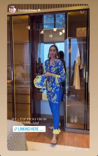 Top- Blue Floral sequin hand embroidered kurta with scalloped neckline and fringe detailing on the sleeves.