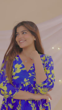 Blue chanderi silk floral short dress. V- neck front, wide 3/4 long sleeves with narrow elasticated cuffs. Gathered seam under the bust at the front and at the back of the waist.